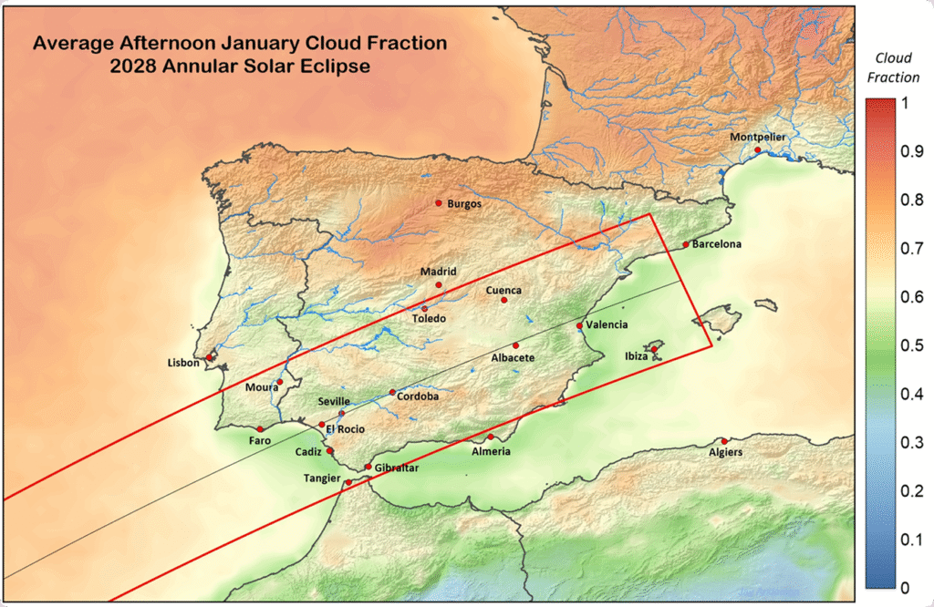 Cloud maps reveal that January conditions are considerably cloudier compared to the August eclipses of 2026 and 2027. As the eclipse concludes at sunset over Spain, observers must contend with significant winter cloudiness. Average cloud cover along the eclipse track ranges between 50% and 75%. Terrain plays a role, with lower cloudiness generally found on south-facing mountain slopes, influenced by downslope winds.