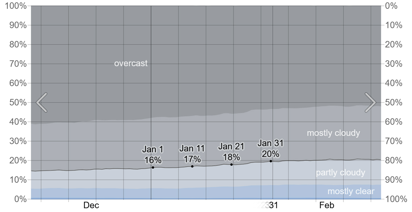 - Africa: Angola and western Zambia offer some of the best chances for clear skies, with probabilities near 80%. Eastern Zambia averages around 70%.