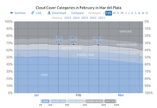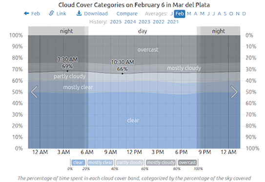 February corresponds to late summer in Argentina and Uruguay (the equivalent of August in the northern hemisphere). Warm temperatures, generous sunshine, and minimal rainfall make this period an ideal setting for witnessing the celestial event.