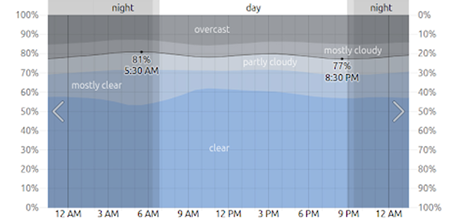 On 1 June, the cloudiest day of the year, the likelihood of mostly cloudy or overcast skies is 57%.