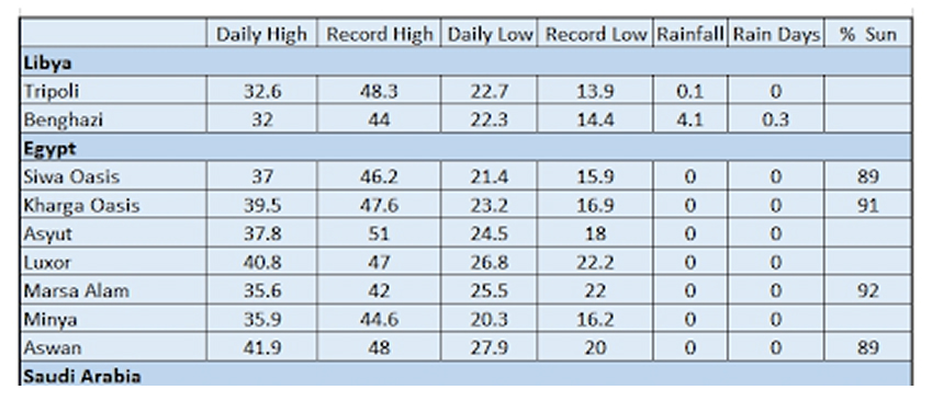 Unlike most eclipses, where cloud risk dominates, here the main challenge is temperature. Afternoon highs frequently reach the mid-40s °C, with extremes approaching 50 °C (110–120 °F). In Luxor, historical records show an average of 42 °C on 2 August, with peaks of 46 °C.